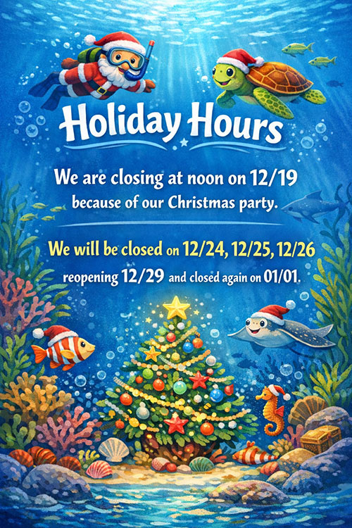 Holidays Hours: Friday 12/19 Closing at 12PM, we will be closed on 12/24, 12/25, 12/26 and 01/01